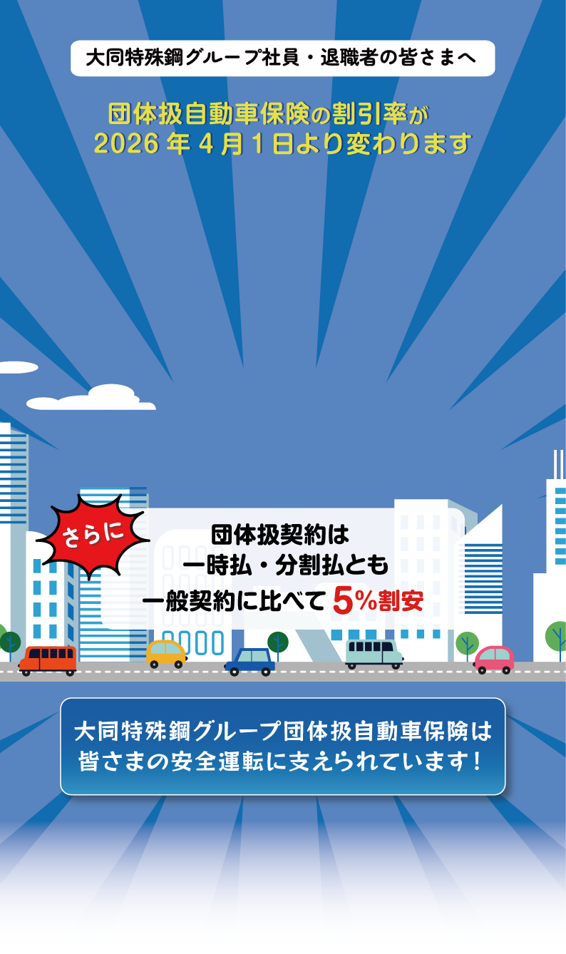●このwebサイトは自動車保険の団体扱割引の概要についてご紹介したものです。ご契約にあたっては、必ず『重要事項説明書』または、『重要事項のご説明』等をよくお読みください。また、 詳しくは引受保険会社東京海上日動火災保険株式会社の『パンフレット』および、『ご契約のしおり(約款)』・『普通保険約款および特約条項』等をご用意しておりますので、必要に応じて取扱代理店にご請求ください。●団体扱契約としてご契約いただけるのは、保険契約者・記名被保険者・車両所有者が引受保険会社の定める条件を満たす場合のみとなります。ご不明な点等がある場合は取扱代理店までお問い合わせください。●団体扱特約失効時の取扱いについては、取扱代理店までお問い合わせください。 ●大同特殊鋼グループの団体扱割引25.5%は2026年4月1日から2027年3月31日までの保険始期契約に適用されます。(団体扱割増引制度は団体のご契約台数と損害率により毎年4月1日に見直しをされ、変更する場合があります。(引受幹事保険会社:東京海上日動火災保険株式会社 引受非幹事会社:あいおいニッセイ同和損害保険株式会社、損害保険ジャパン株式会社、三井住友海上火災保険株式会社)